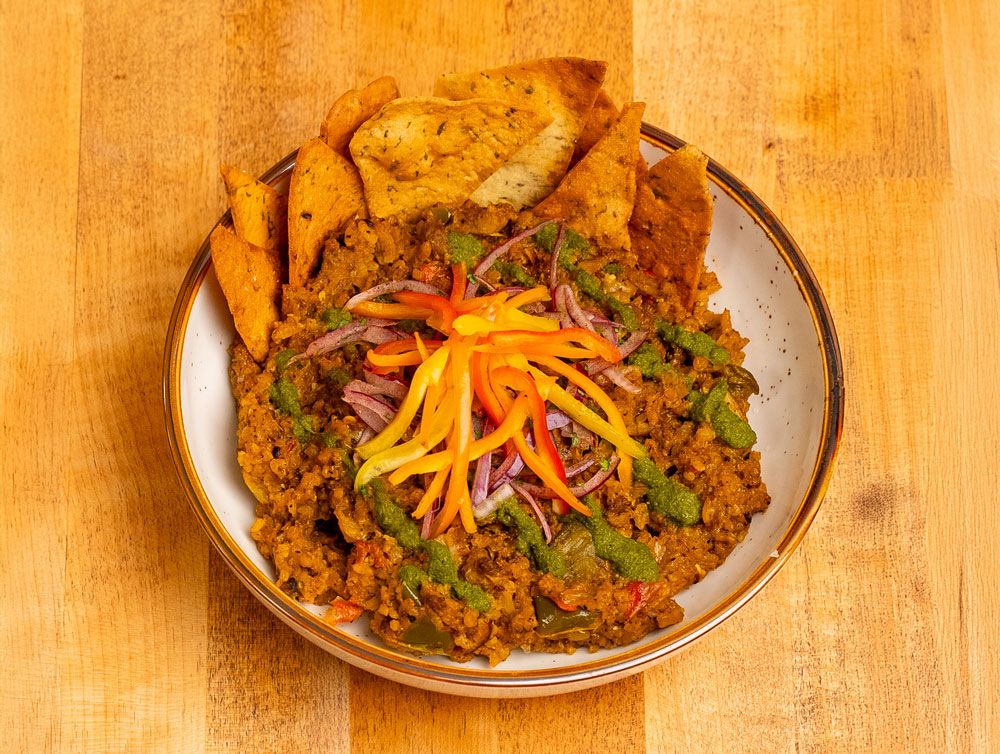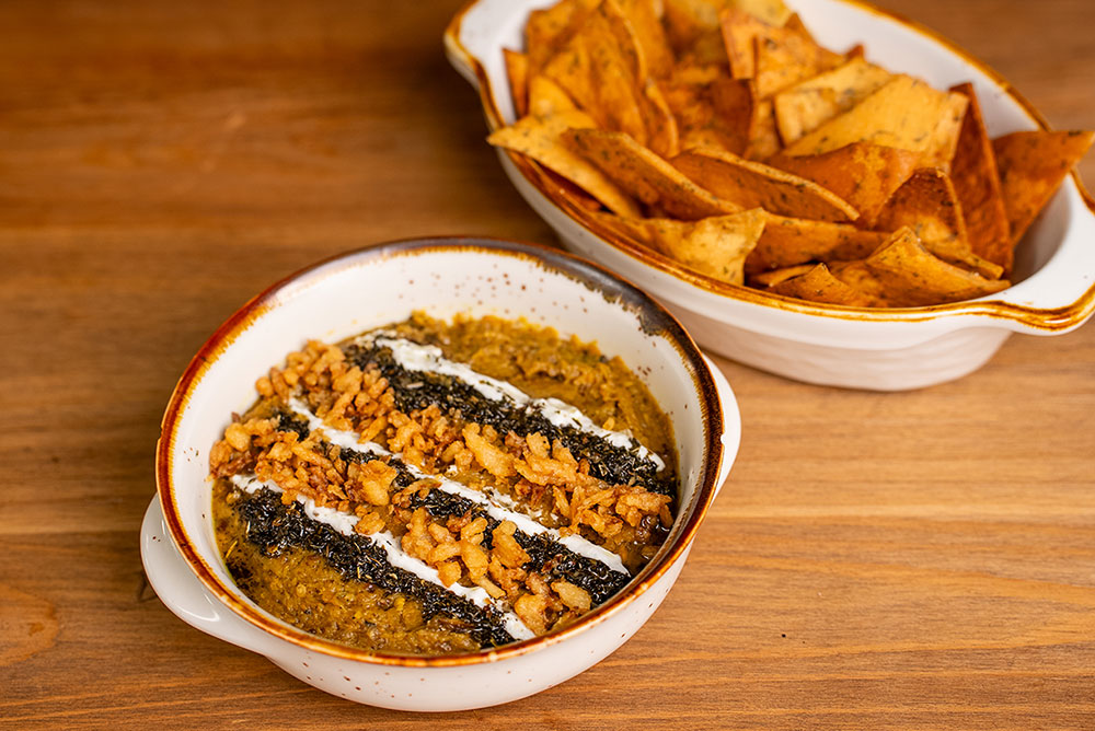 Roasted eggplant, garlic and caramelized onions topped with a drizzle of tangy fermented yogurt sauce and fried mint. Served with pita bread.