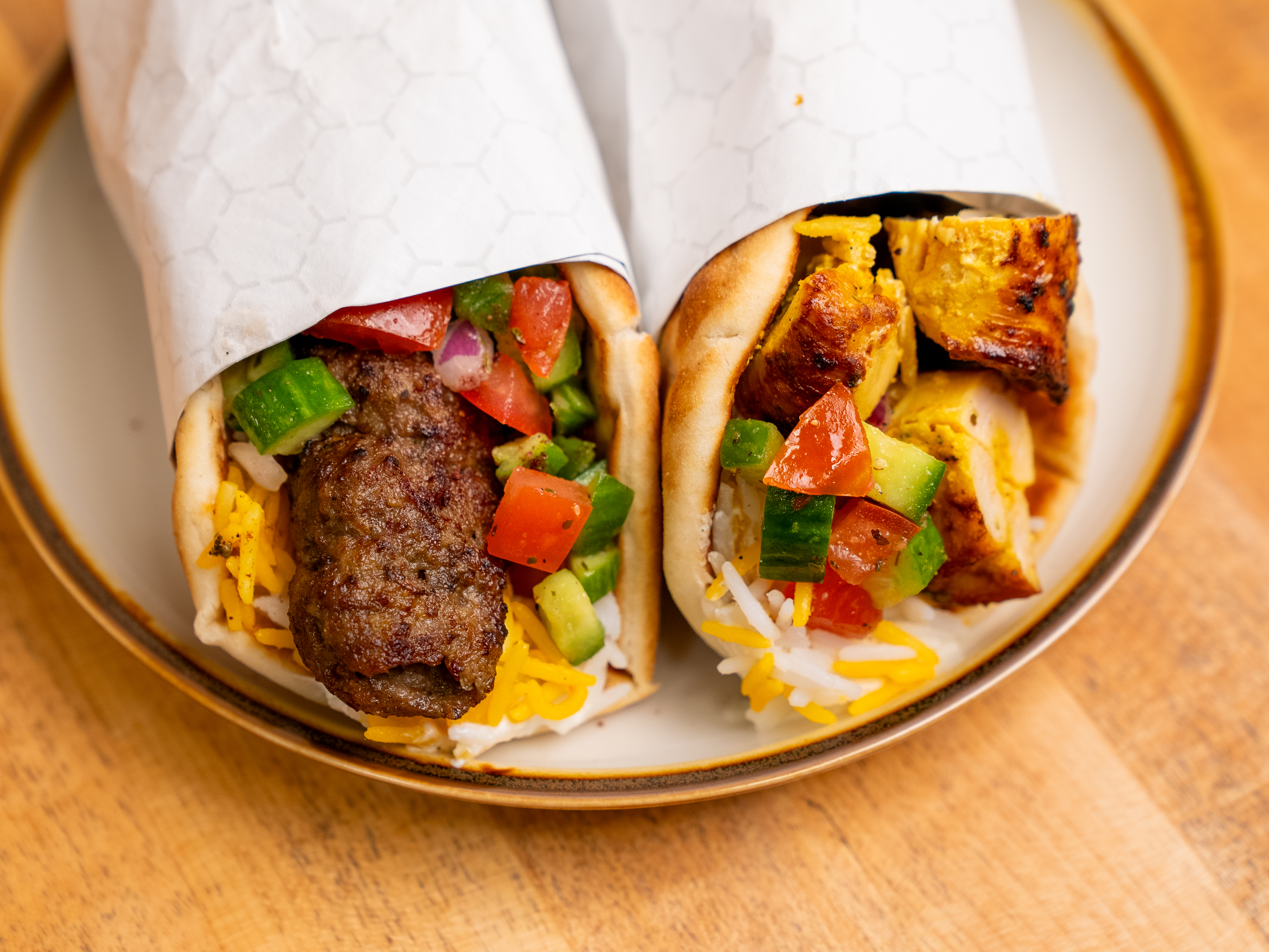 Skewer of your choice with basmati rice, shirazi salad, shallot yogurt, and drizzle of either red chile or sabzi sauce wrapped in pita bread.