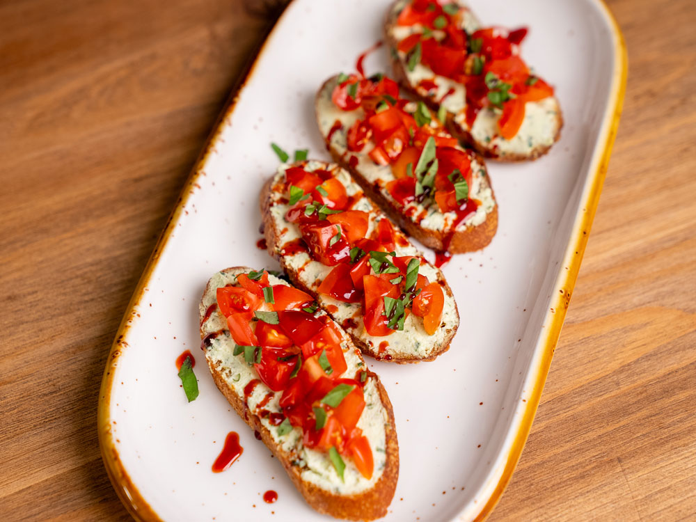 Toasted bread topped with whipped basil feta, fresh tomatoes, and basil (4 pieces).