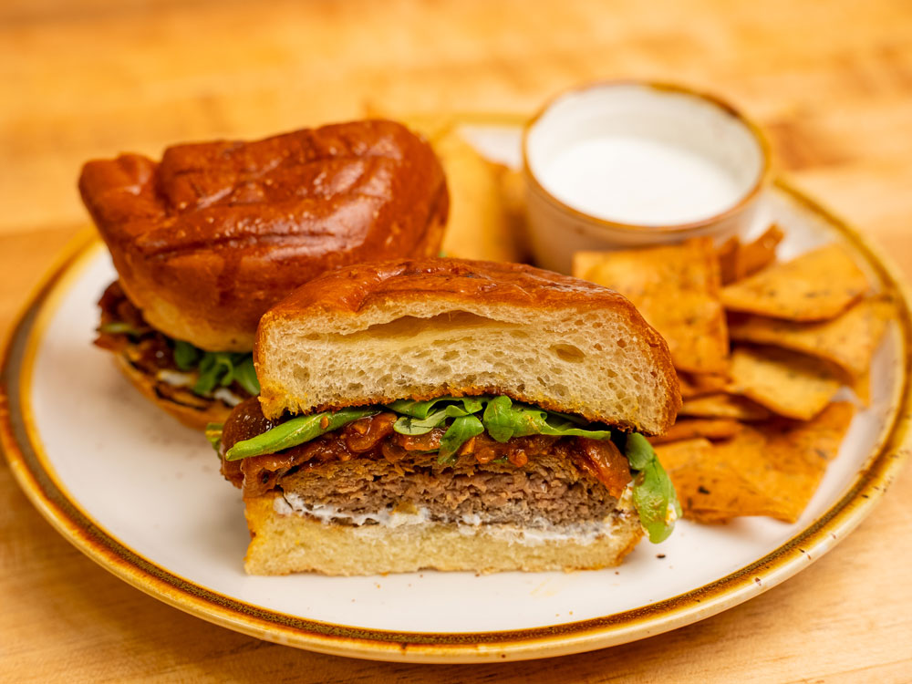 Lamb and beef patty topped with caramelized onions, tomato jam, shallot yogurt, arugula on a brioche bun. Served with garlic and herb pita chips and shallot yogurt dip.