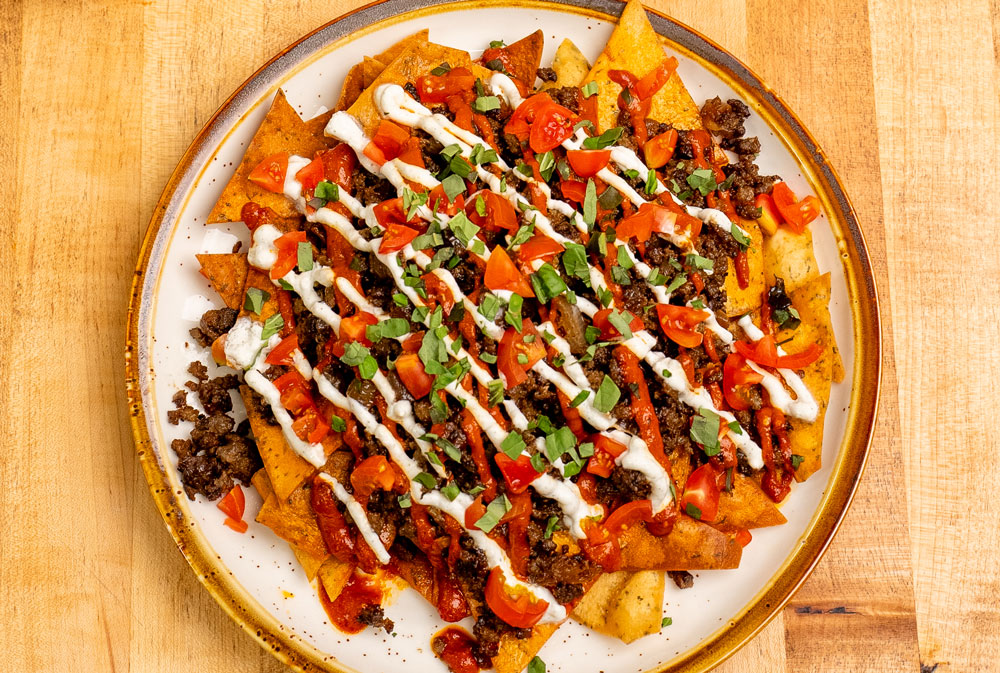 Housemade pita chips topped with koobideh beef, red chile sauce, shallot yogurt, fresh tomatoes, and basil.