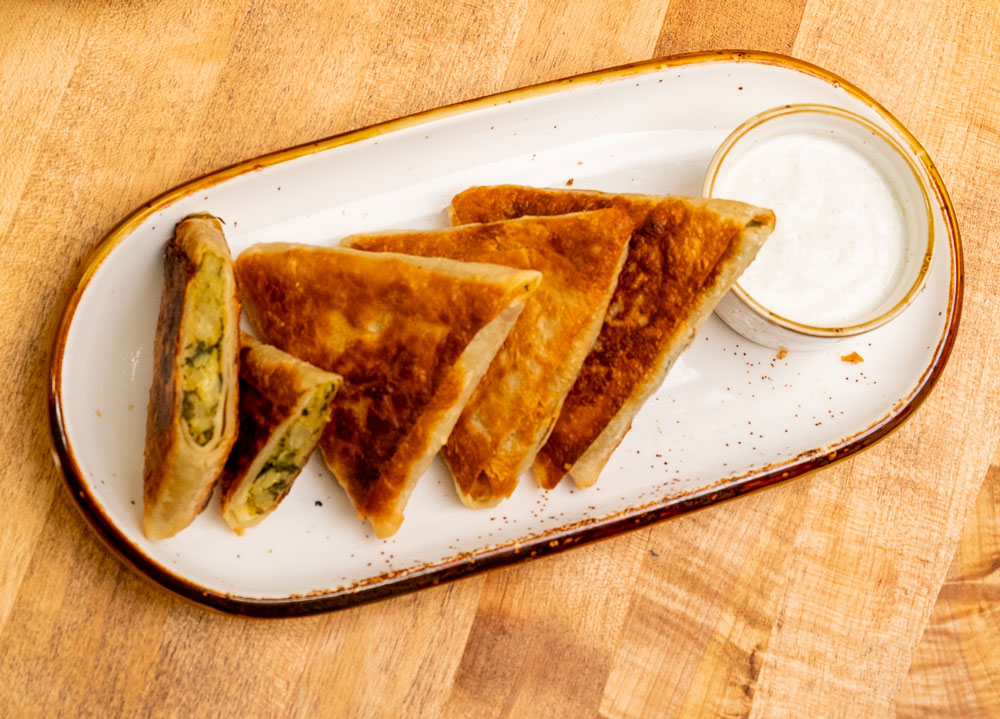Pan fried pastry filled with potatoes, caramelized onions and fresh herbs (3 pieces).